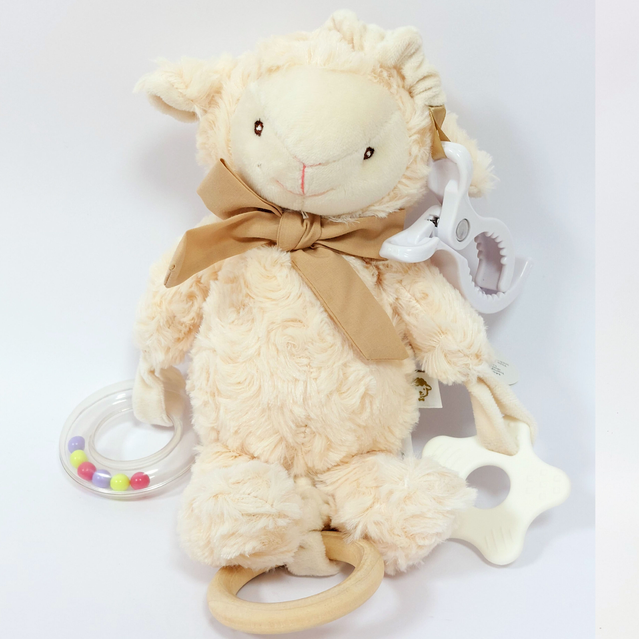 צעצוע כבשה רך ונעים למגע, בטיחותי ומאד מהנה! מרגיע את הבייבי ומעסיק מגיל חודש עד גיל שנתיים, עם נשכן, רעשן וטבעת עץ, עם מנגינה להרגעה